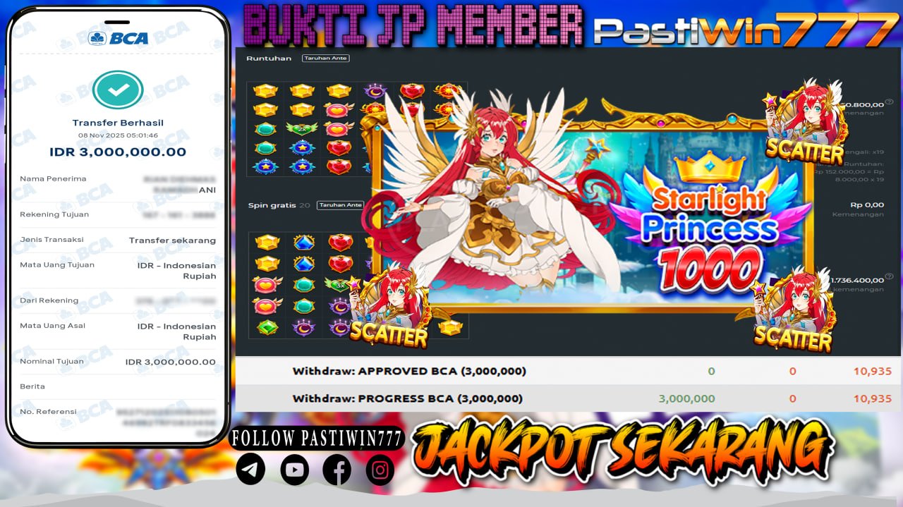 Kami ucapkan selamat kepada member PASTIWIN777 dengan user ID ” Boboib**** ” atas kemenangan nya bermain slot di game ” Starlight Princess 1000 “. Bukti Jp pembayaran member PASTIWIN777 lunas secepat kilat.
