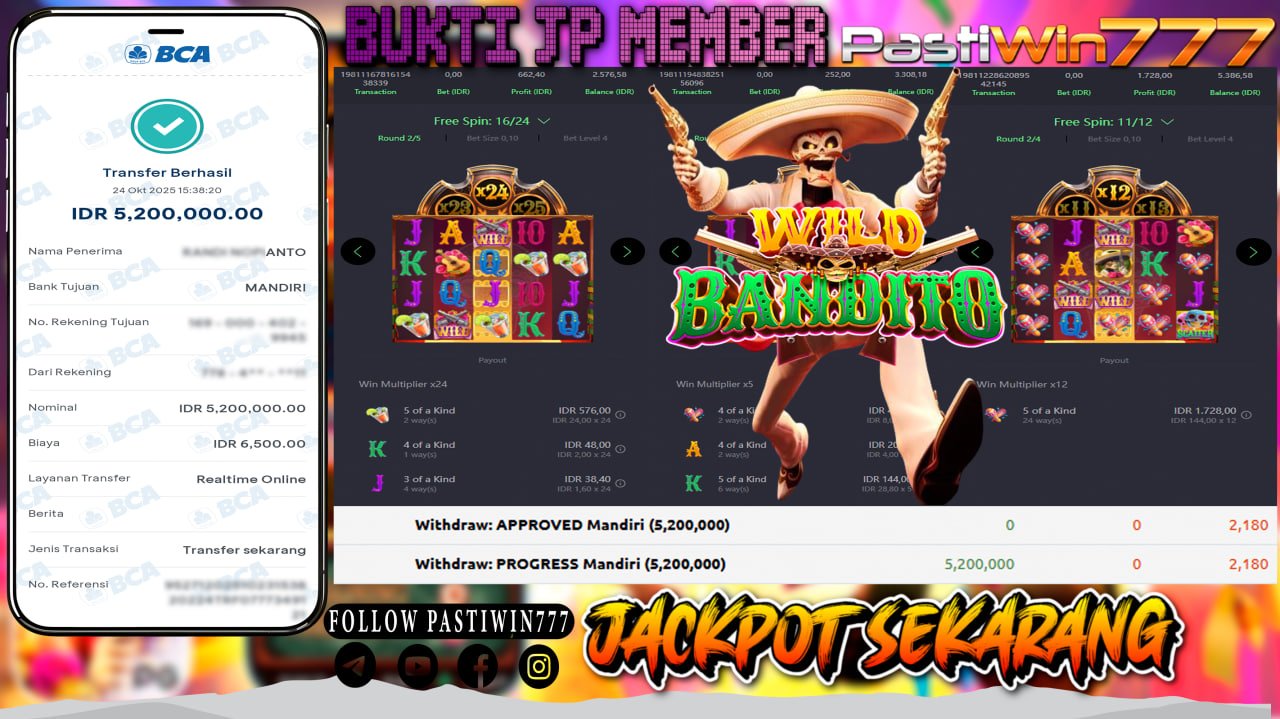 Kami ucapkan selamat kepada member PASTIWIN777 dengan user ID ” minio******* ” atas kemenangan nya bermain slot di game ” Wild Bandito”. Bukti Jp pembayaran member PASTIWIN777 lunas secepat kilat.